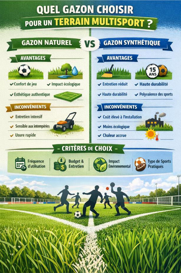 Face au dilemme entre gazon naturel et gazon synthétique, plusieurs critères entrent en jeu pour déterminer la meilleure option pour un terrain multisport.